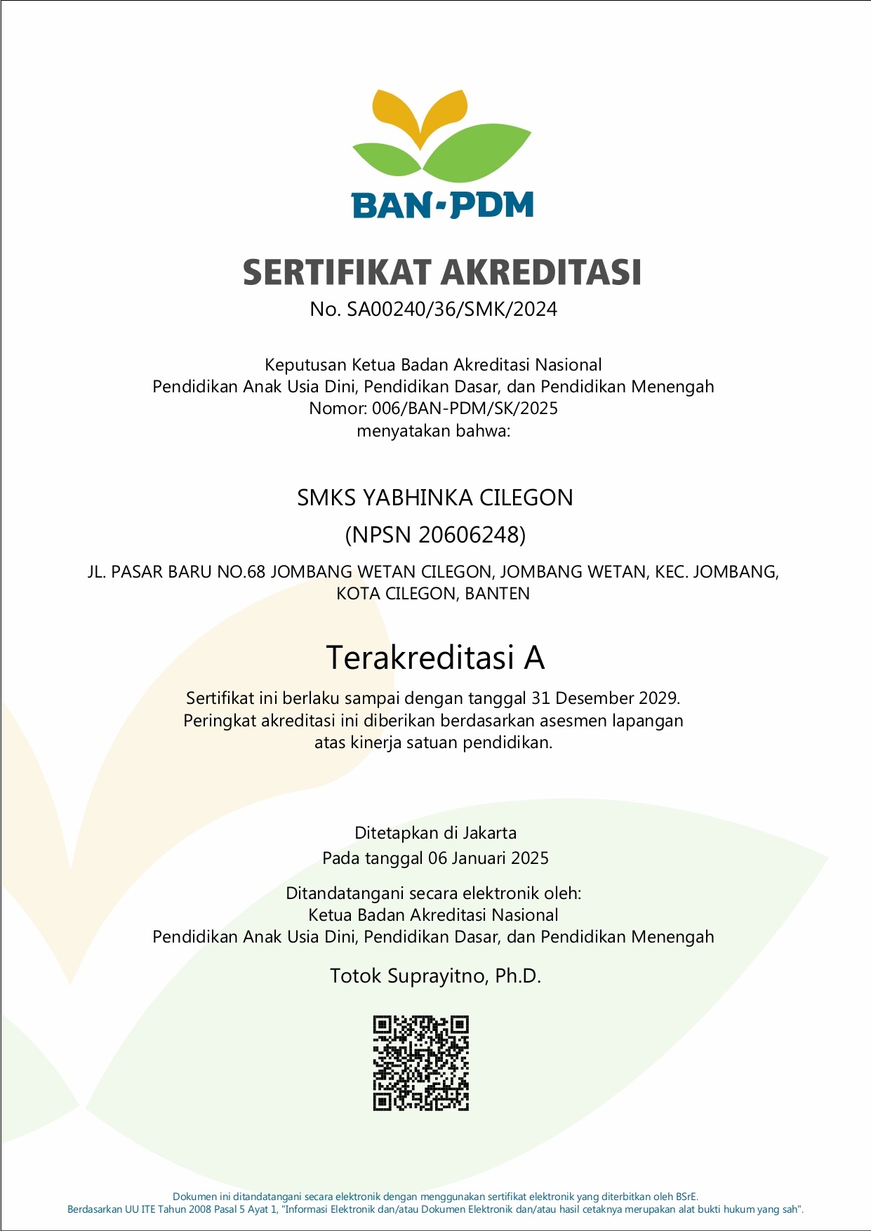 Sertifikat Akreditasi SMKS Yabhinka Cilegon